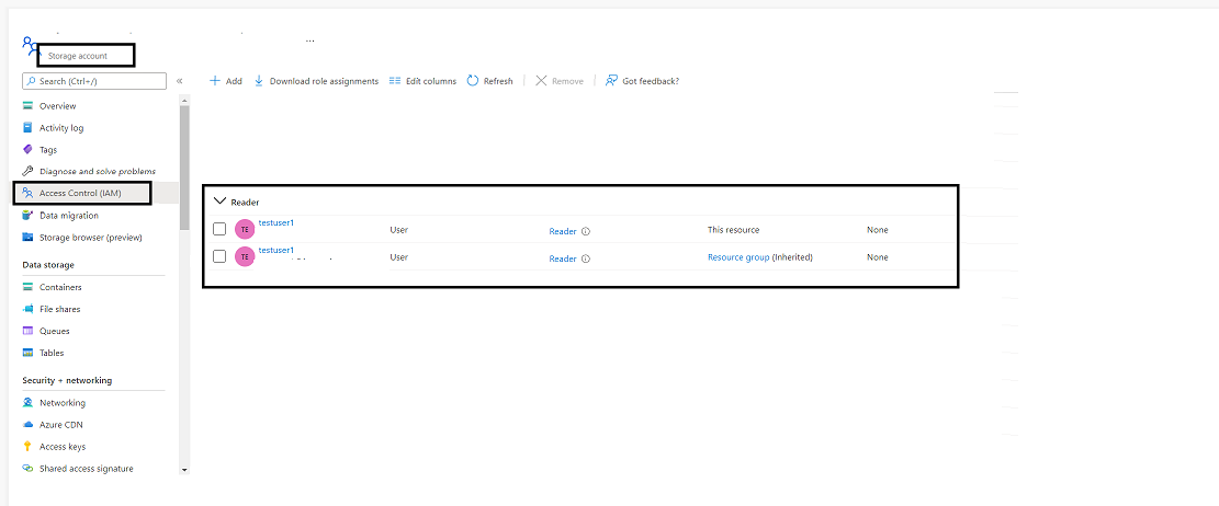 Wohoo, at storage account level we can see the reader role is assigned to the test user and the same is inherited from the Resource Group.