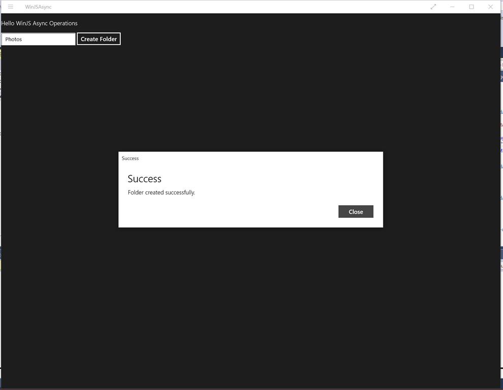 - var msg = new Windows.UI.Popups.MessageDialog("Folder created successfully.", "Success");