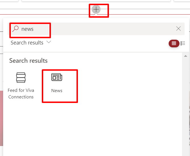 Add the news webpart. Click on “+” icon and then search news in the search box. Select the news webpart.