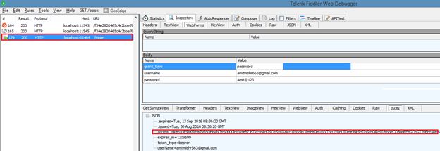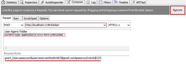 In the below screenshot, you can see how you can call this API. Post is the HTTP method that means request would be Post type and the URL would be api/Account/Register. To call this API, I’ll use Fiddler.