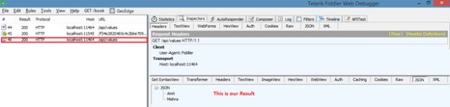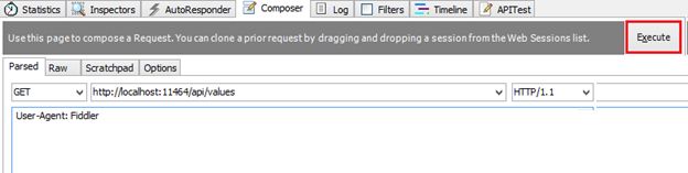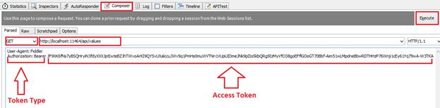 To call the Values Controller, make some changes in the Fiddler once again. This time, the HTTP request would be “Get” and URL would be of “Values Controller”. Pass the header of Authorization bearer along with the Authentication token which looks like the following figure. Hit the Execute button.