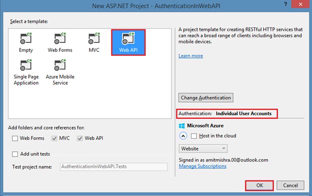 Select Web API template from the templates and choose the authentication that you want, by clicking on Change Authentication. The Individual User Accounts option is for the applications that store user profiles in a SQL Server database. So, you can register or sign in using the existing account for Facebook, Twitter, Microsoft, Google, or another provider of your choice.