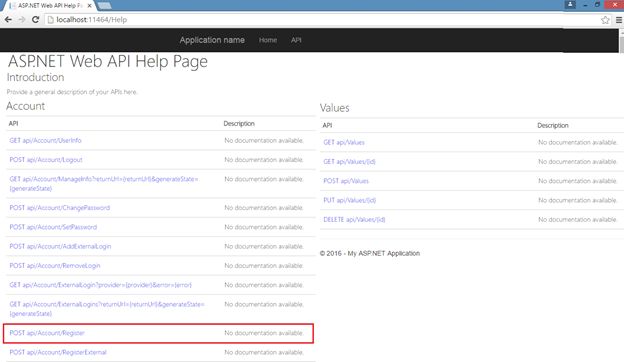 In this API, you will find Account and Values Controller (API Controllers). In Account Controller, you can see there are many APIs, such as UserInfo, Logout, and so on. But, we’ll work on Register method. In the Values Controller, there are several HTTP methods. Click on to Register method to see how many strings there are.