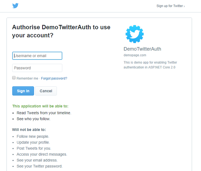 We have successfully created a Twitter app and used it to authenticate our ASP.NET Core application. I have attached the source code for your reference. Please note that secrets.json file contains dummy values. Hence, replace the values with the keys of your Twitter app before executing it.
