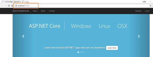 Note the URL from the browser address bar. In this case, the URL is http://localhost:51763/. We need this URL to configure our Twitter App which we will be doing in the next section.