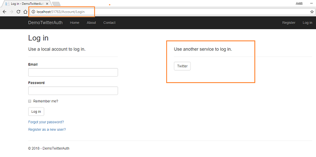 Launch the application and click "Login" in the top right corner of the homepage. You will be redirected to http://localhost:51763/Account/Login page, where you can see the option to login using Twitter on the right side of the page.