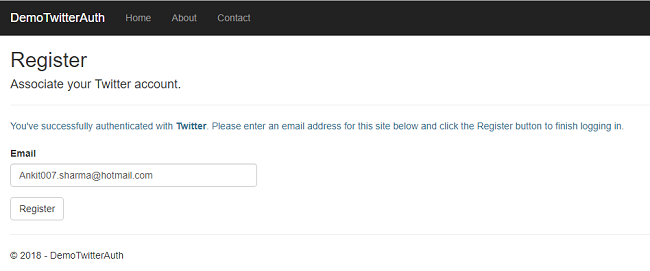 Once you click on Authorize app, the application will take a few moments to authenticate your Twitter account and upon successful authentication, you will be redirected to a registration page inside your application where you need to fill in an email id to tag with your account.