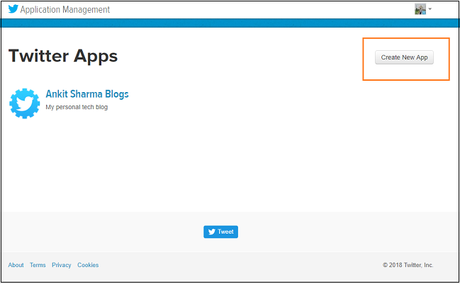It will show all your Twitter Apps configured. Since I have already configured a Twitter App, so it is being displayed. If you are creating for the first time, it will not show anything. Click on “Create New App” button in the top right corner. It will open a form and ask to fill out the details to create a new app.