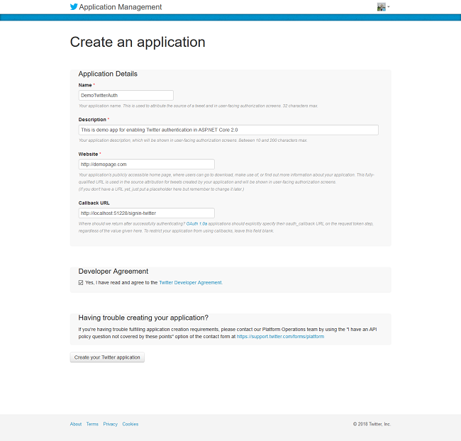 Before we start building our ASP.NET Core 2.0 application we need to create and configure the Twitter app so that we can use it to authenticate our application.