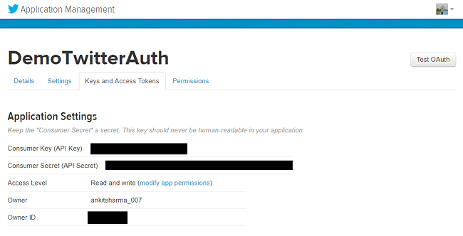 Accept the Developer agreement by clicking the checkbox and click on “Create your Twitter application” button. You will be redirected to your newly created Twitter app page and you can also see a success message as shown in the image below.
