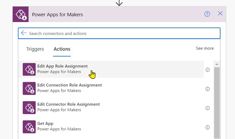 Create new flow with trigger, as shown above, -> Look for PowerApps for maker connector -> Add Edit App role assignment action