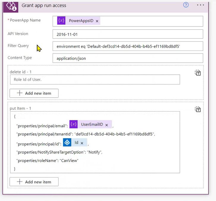 Role – add a string of what role you want to assign. If you want user to grant run permission, then pass CanView string.