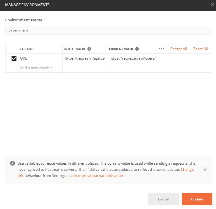 As we saw here, every time we need to add the same URL to the multiple requests, only the user id is getting changed. So, in such cases, to enable reuse and to avoid typos we can create variables by clicking this setting button on the right top corner.