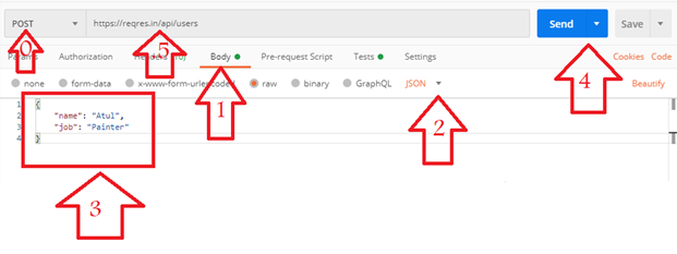 Select Method as GET and URL as https://reqres.in/api/users/1 to fetch the user with Id = 1 and hit the Send button as shown here 1, 2 and 3..