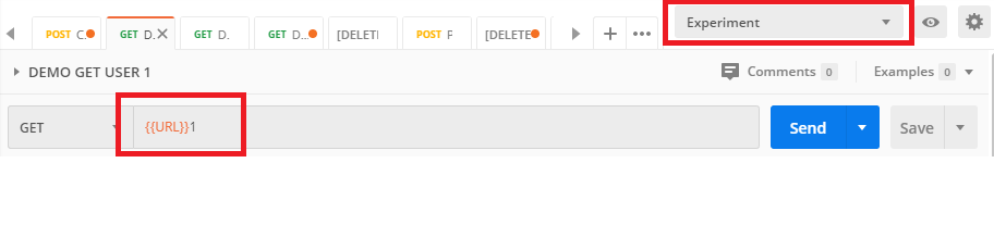 Now, key in the variable name between double curly braces i.e. {{URL}}1 and append the user id. You will get IntelliSense as well.
