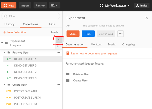 Unlike this example, you may have thousands of test cases to test and run. You may need that to share with your team as well. For this purpose, you can export (1) and Import (next to New) the collection and start testing from the below screenshot.