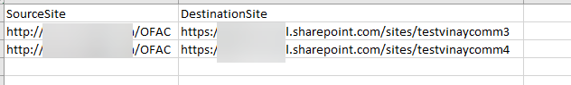 - The source and destination sites can be loaded from CSV. Following is the screen capture of the template.