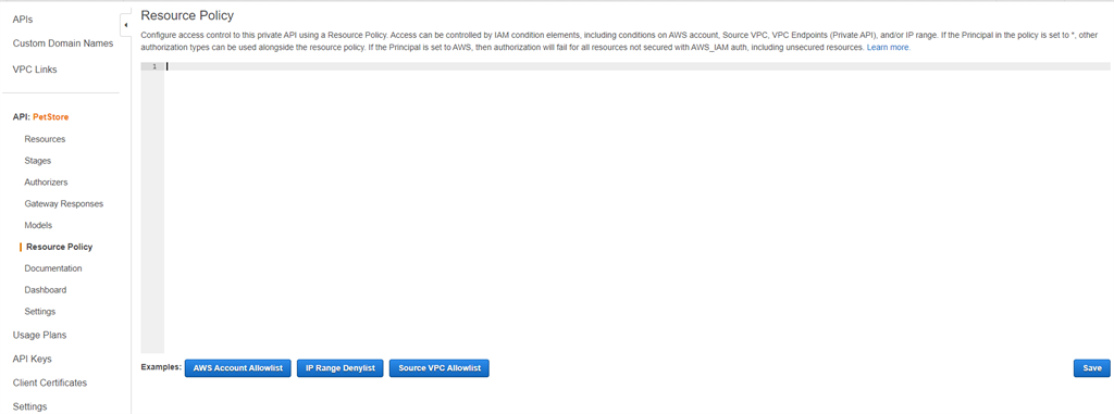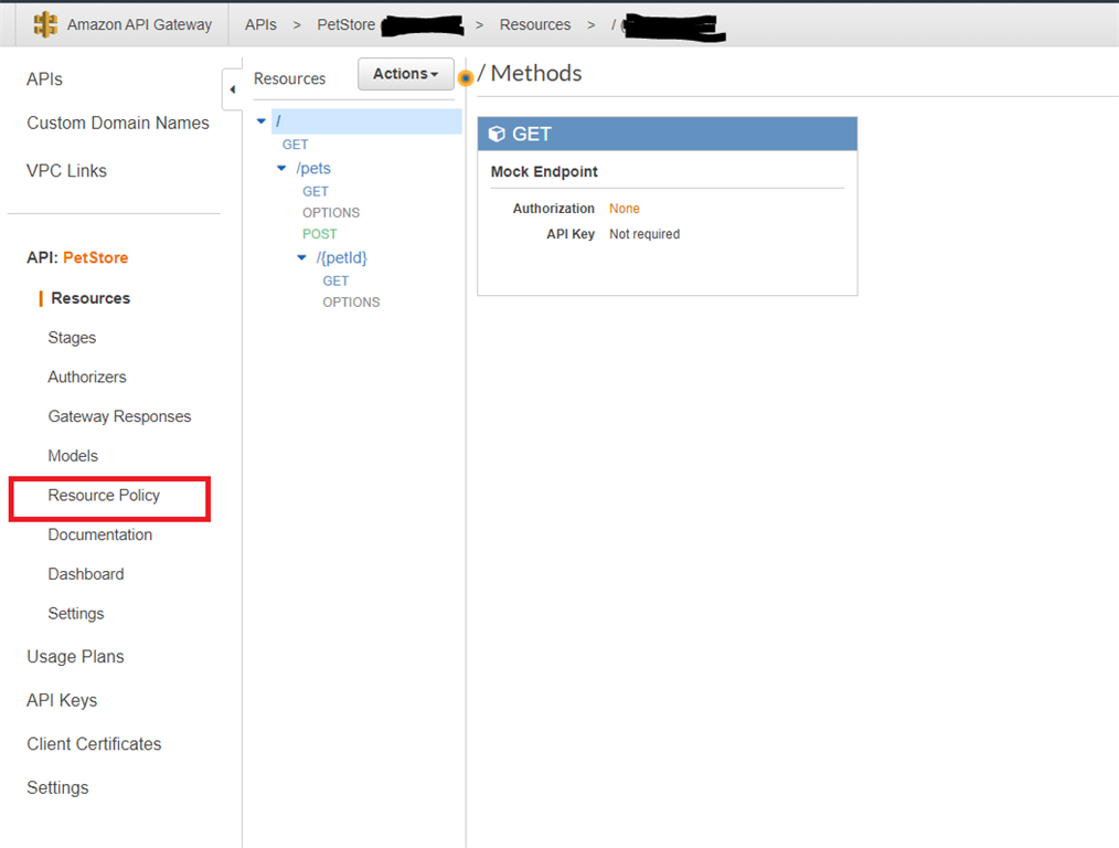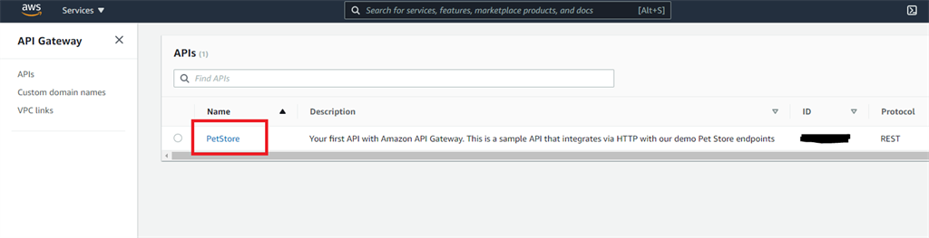 Click on the name of the API you want to secure. In this case it's PetStore (this is one of the example APIs you can create in API Gateway)