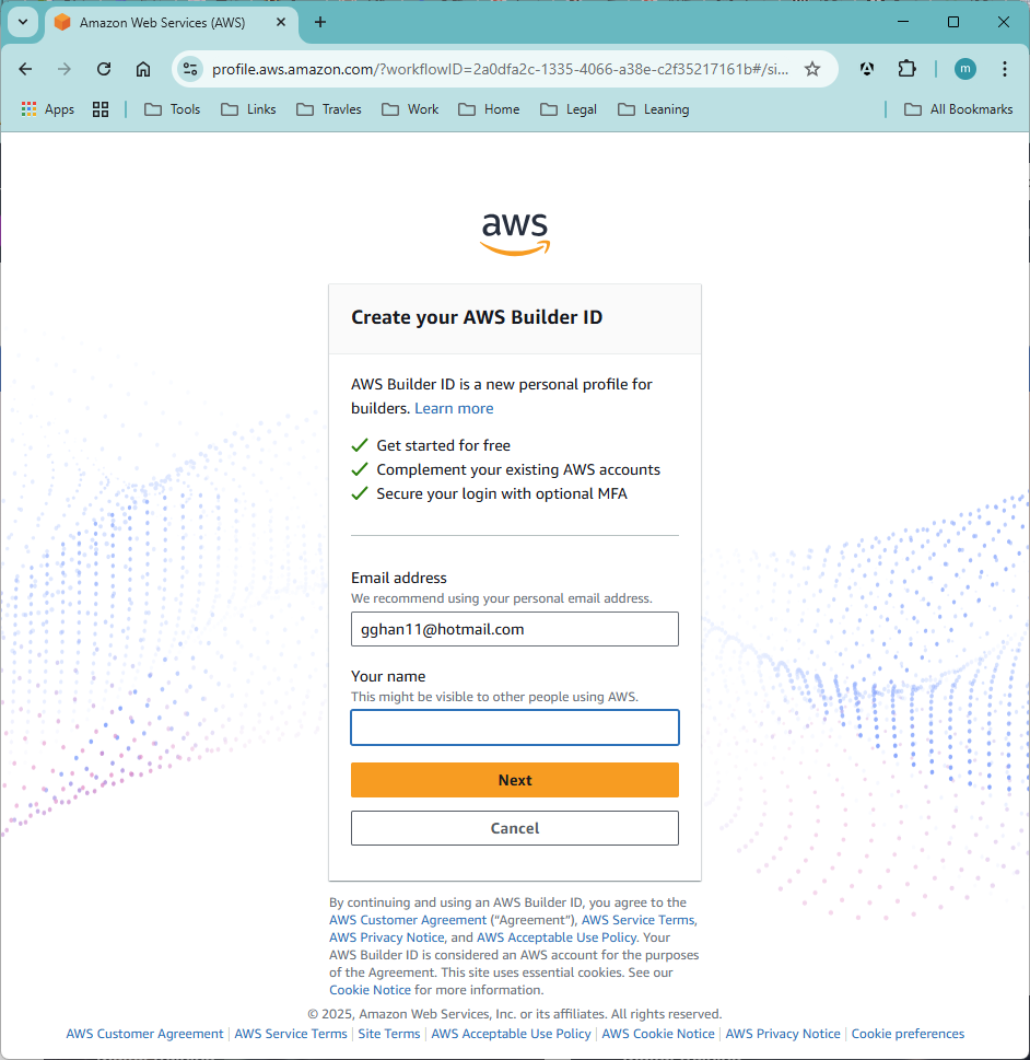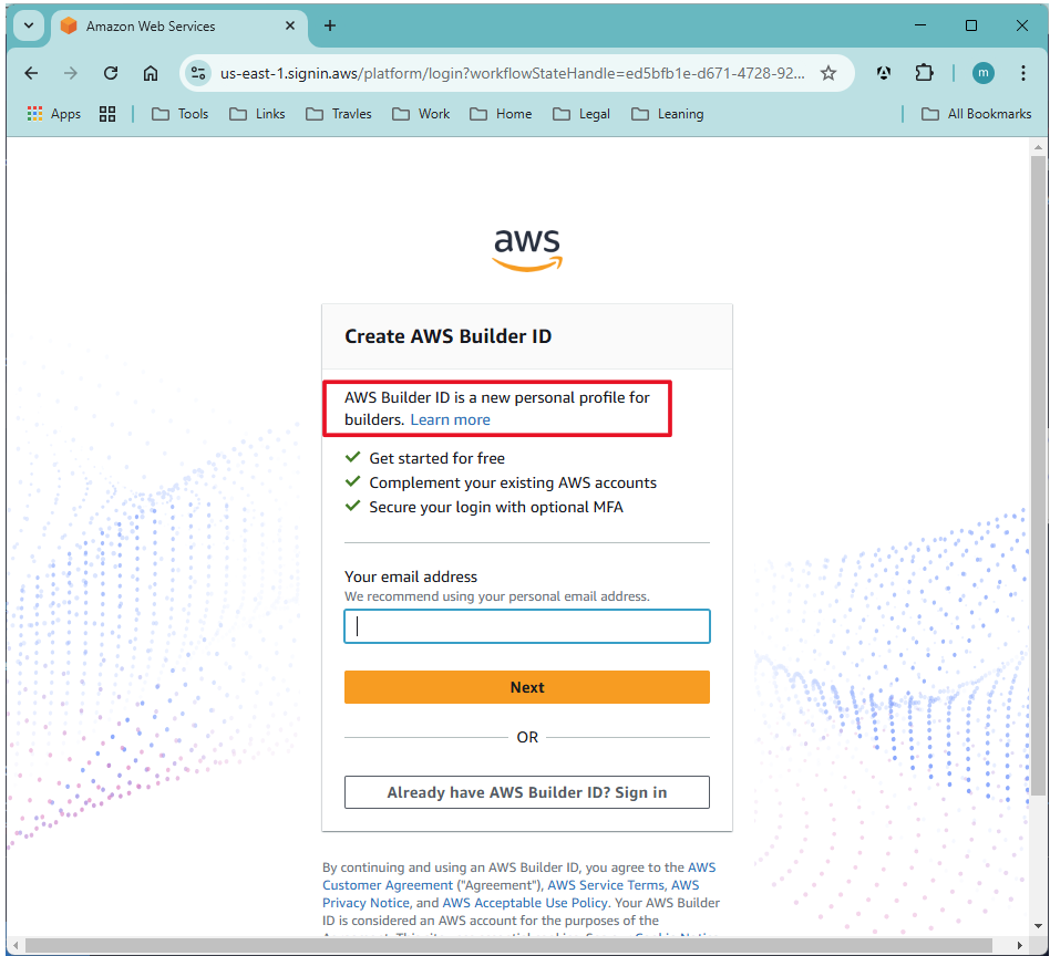 - As an AWS Builder ID user, you specifically sign in to the AWS service or tool that you want to access. An AWS Builder ID user complements any AWS account you already have or want to create. An AWS Builder ID represents you as a person, and you can use it to access AWS services and tools without an AWS account. You also have a profile where you can see and update your information.