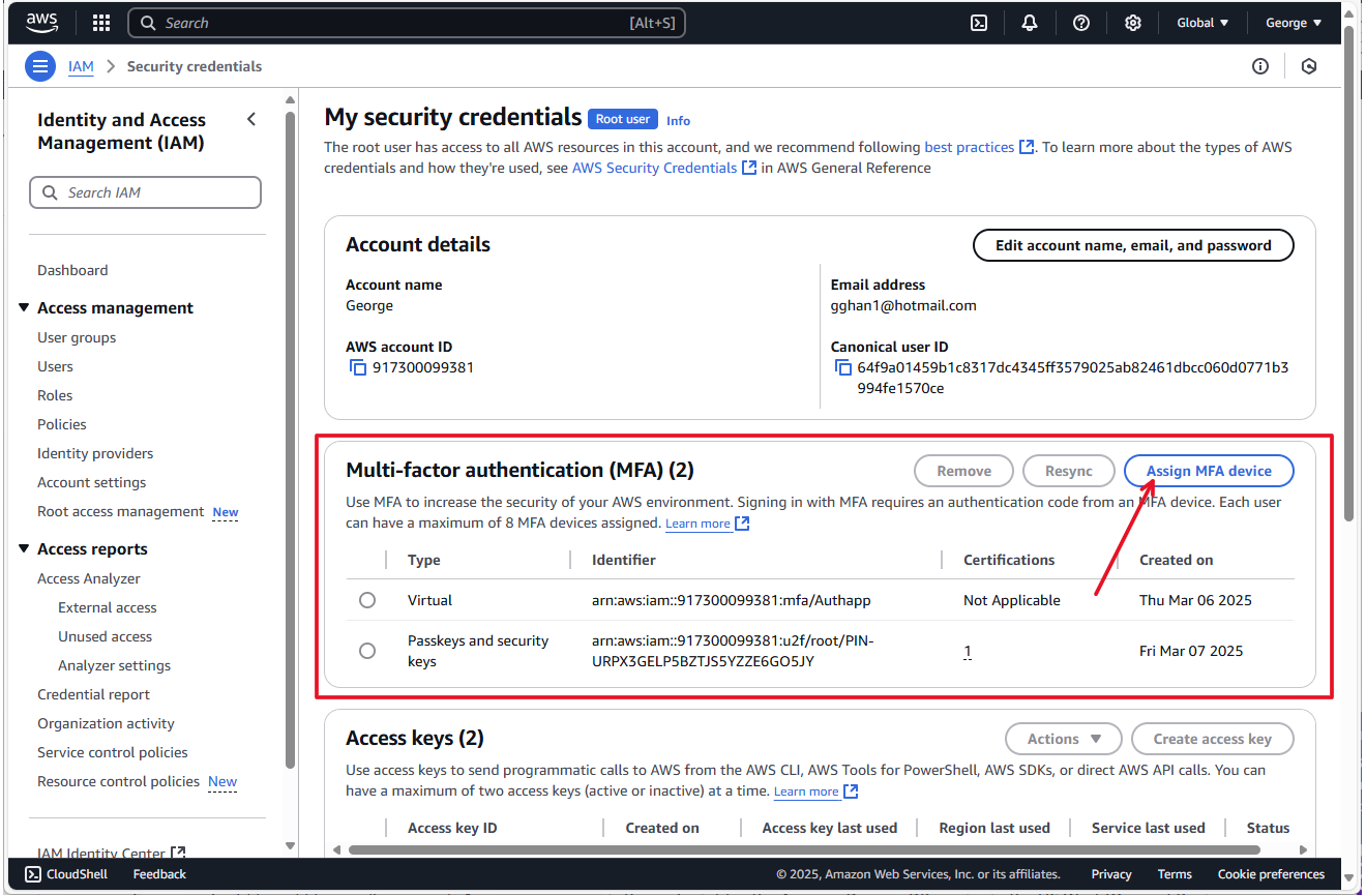 - In the Multi-Factor Authentication (MFA) section: Click Assign MFA device.