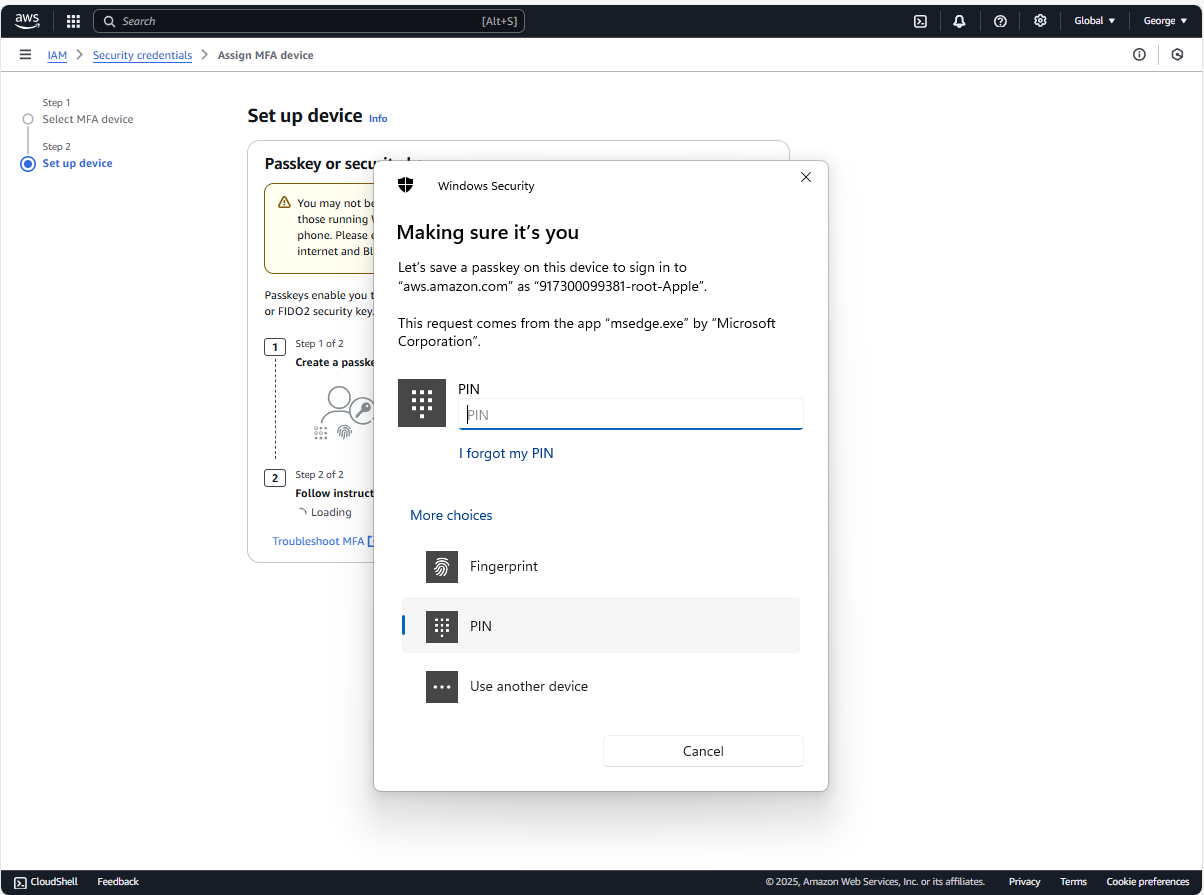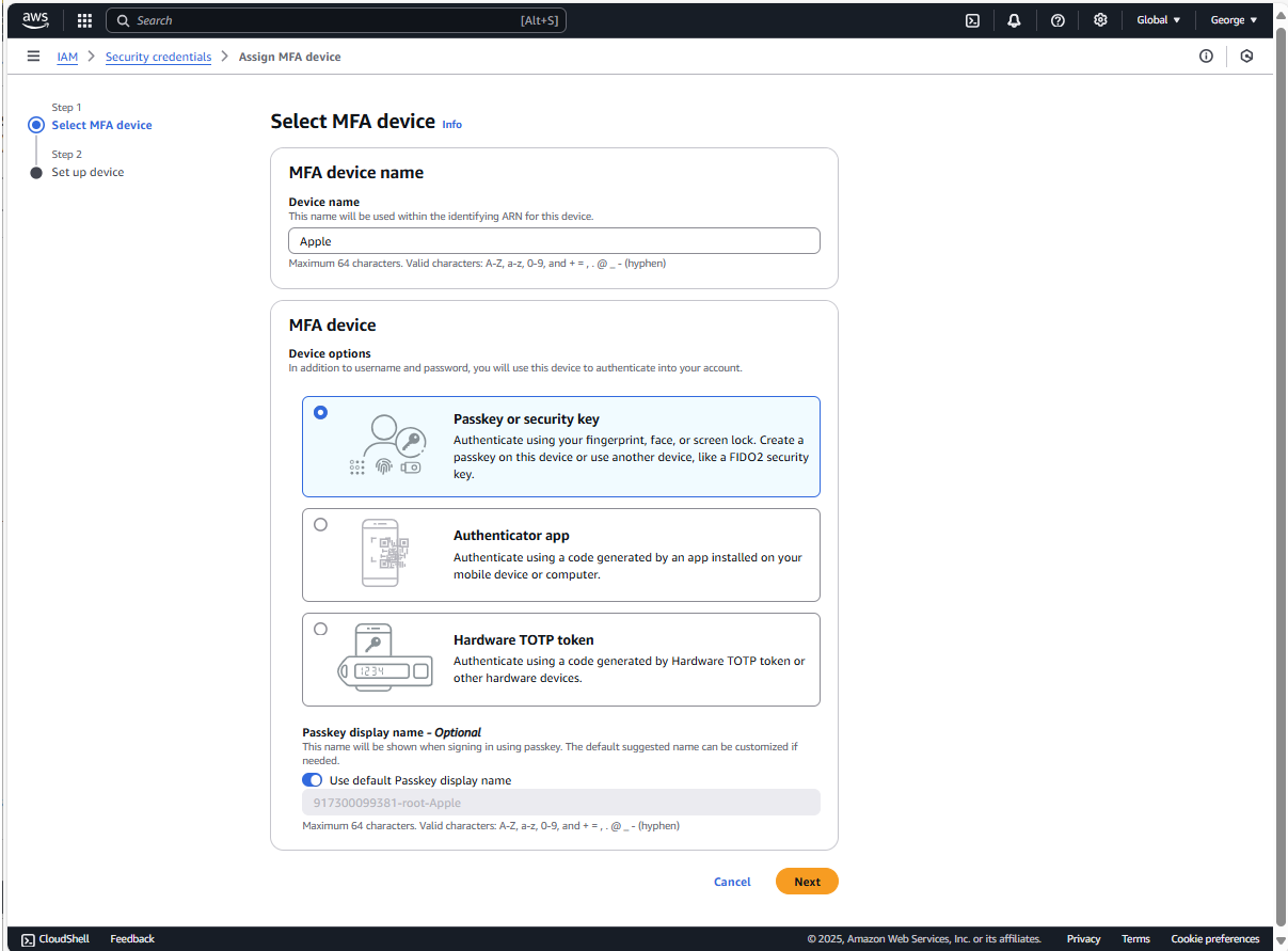 - In the wizard, type a Device name, choose Passkey or Security Key, and then choose Next.