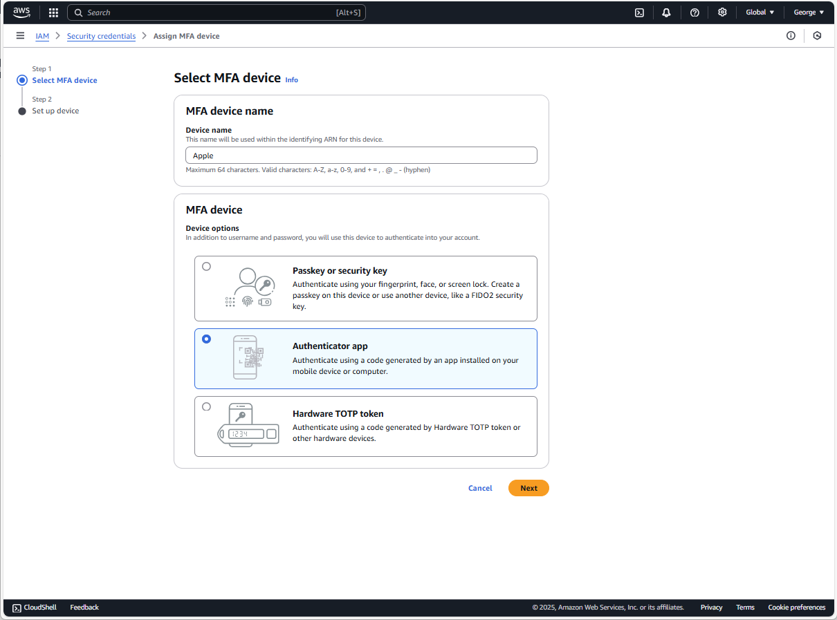 - In the wizard, type a Device name, choose Authenticator app, and then choose Next.