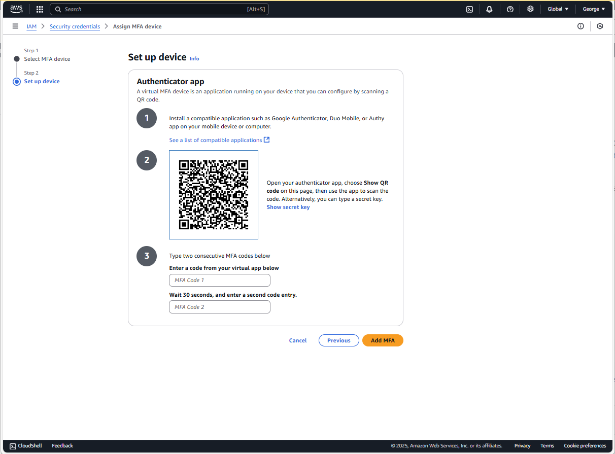You can use the AWS Management Console to configure and enable a virtual MFA device for your root user.
