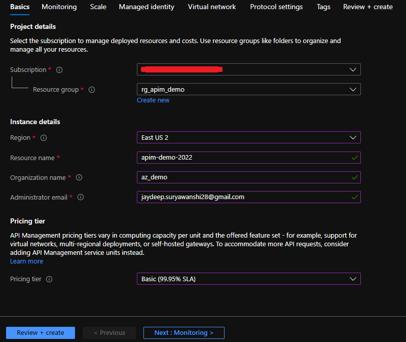 We are selecting ‘Basic Tier’ for this demo, for ‘Basic Tier’ price is ‘$0.21/hour’. While creating APIM, it asks for admin email address where all communication will be sent. You can find more details about tier, pricing, and its feature here: https://azure.microsoft.com/en-us/pricing/details/api-management/