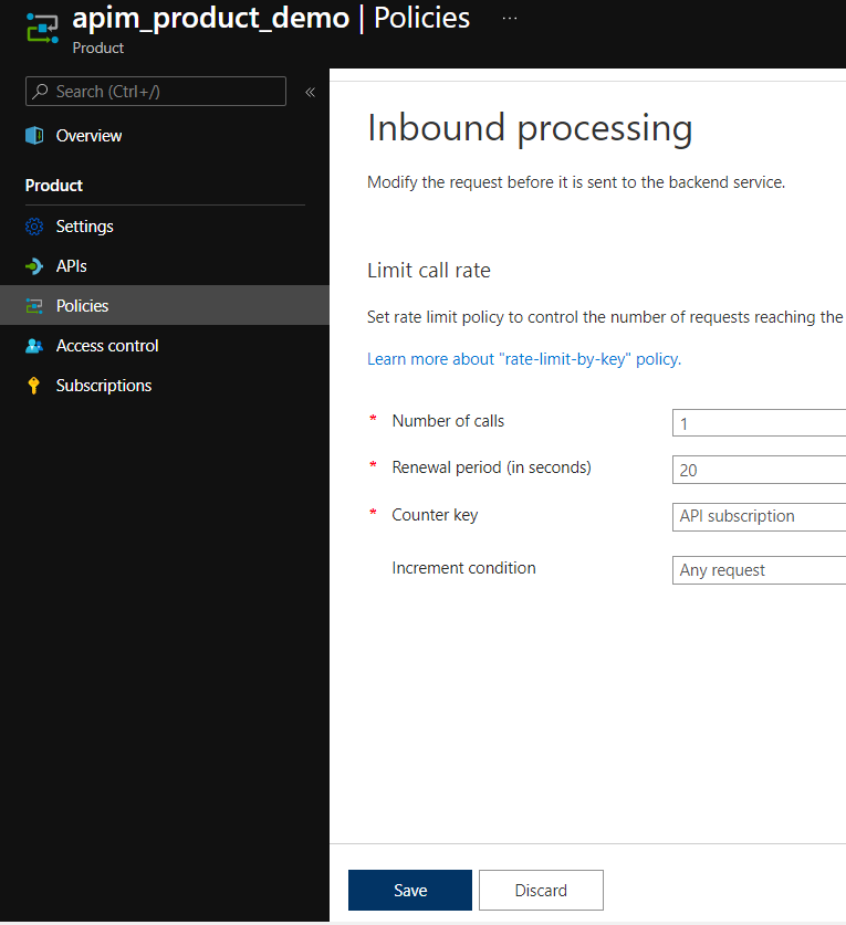 APIM provides a number of filters for both inbound as well as outbound traffic. Let’s add inbound policy to set call rate limit on API as below.