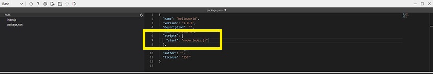Open the package.json file and make a small change on the “scripts” replacing the “test” for “start”.