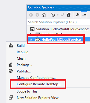 Open Visual Studio and navigate to your Cloud Service. Right click on the Cloud Service project and select “Configure Remote Desktop”, as shown below.