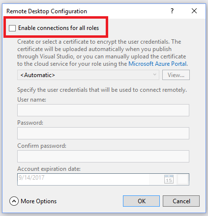 Visual studio will open the following popup where the “Enable Connections for all roles” checkbox is unchecked and so all the options are disabled by default.