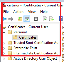 Visual Studio has created and installed a Certificate in the local Certificate repository. Let’s navigate to the Certificate repository typing “certmgr.msc” in the run command (Windows + R), as shown below.