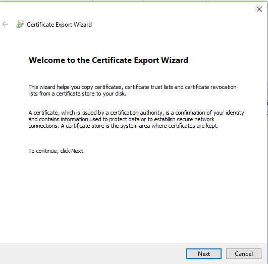 Right click on the Certificate name, select “All Tasks”, and then choose “Export”. It opens a “Certificate Export Wizard”, as shown below.