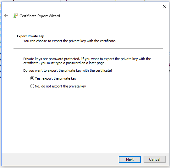 In this step, choose “Yes, export the private key” option and click “Next”.