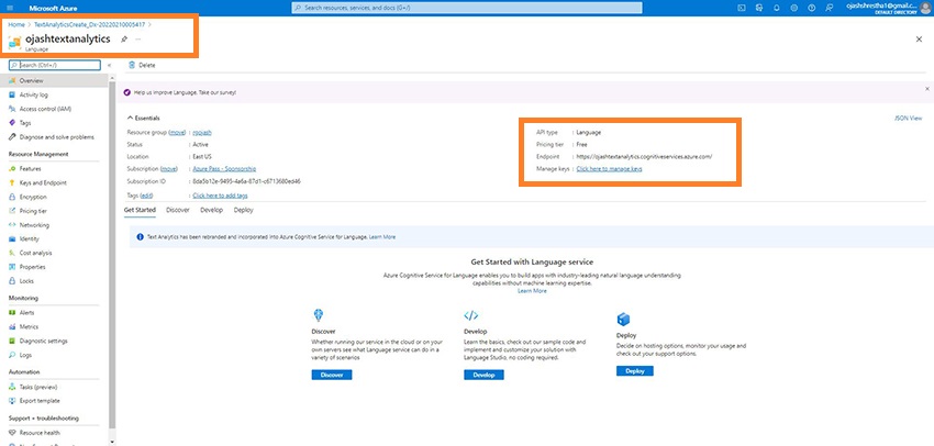 Thus, in this article, we learned about Azure Cognitive Services, Text Analytics and went through the step-by-step process to create a Text Analytics Service in Azure which is now rebranded as Language Service. This will now enable us to use the Natural Language Processing power of Azure for various projects.