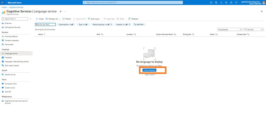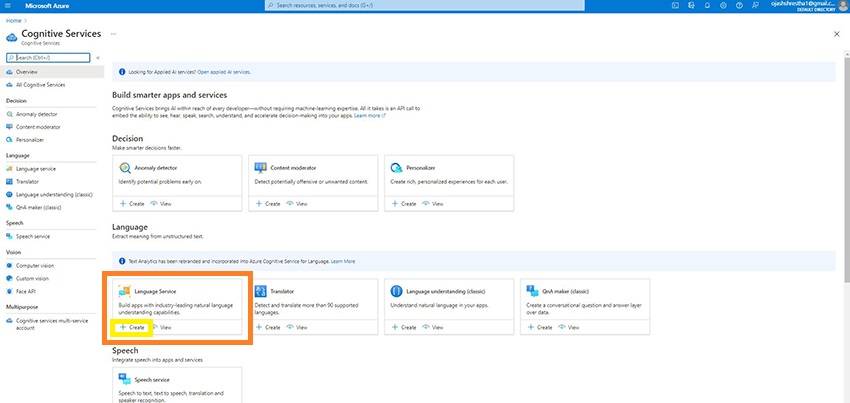 Now, Choose the Cognitive Services under to know about the services or straight away Language.