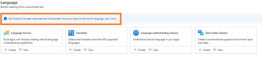 Now, we can see the Language Service under Language. Above, you can see, the note that Text Analytics has now been rebranded and incorporated in Azure Cognitive Service for Language. This basically means that you can use the Text Analytics from the Language Service from now on.
