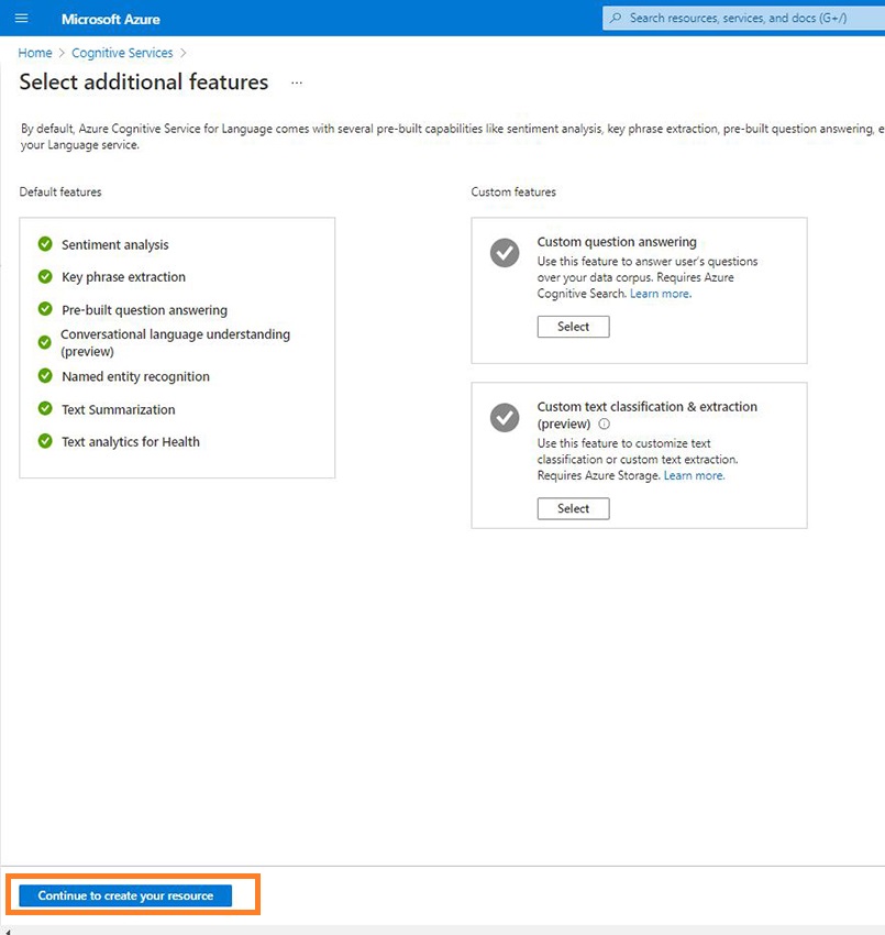You can see the list of default features. You can also use the Custom Features if you need. For now, straight away click on Continue to Create your resource.