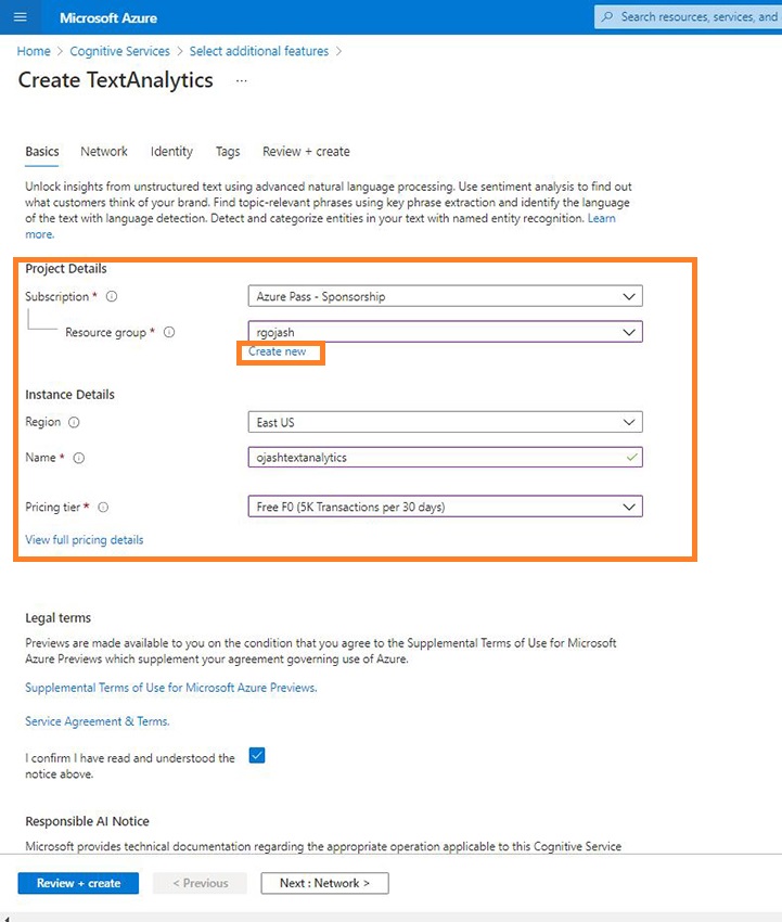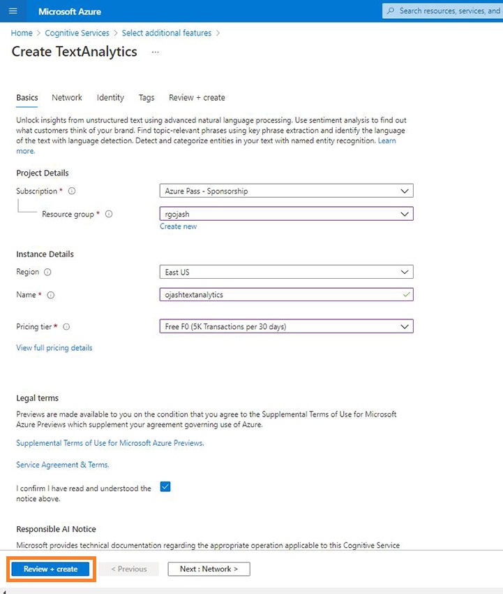 Select the Region, your name and Choose the Pricing Tier. Once, all the details are filled, Click on Review + Create.