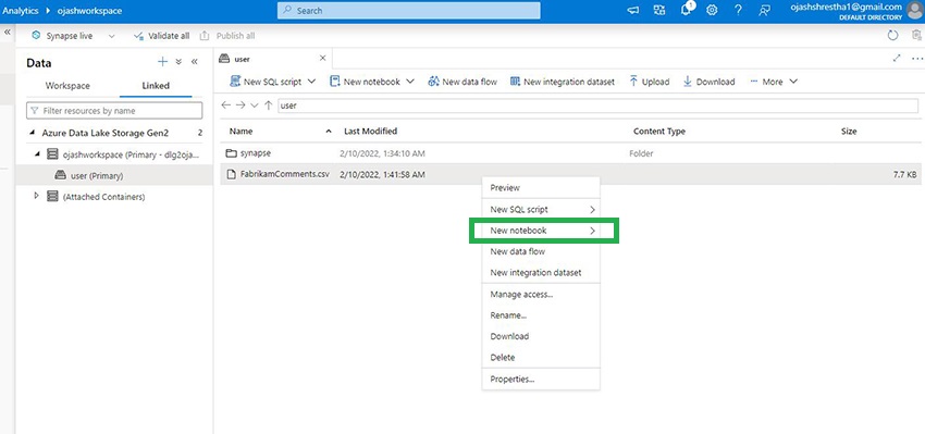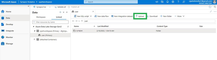 Under Data in the Menu, Visit the Linked page. You’ll see your workspace under Data Lake Storage Gen2.