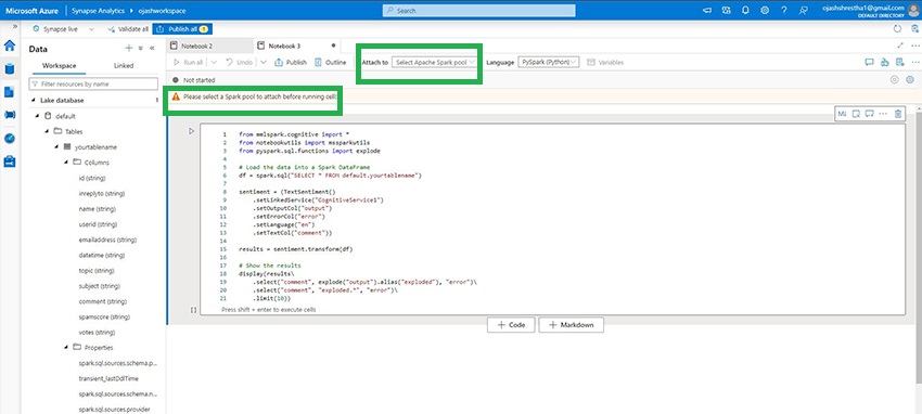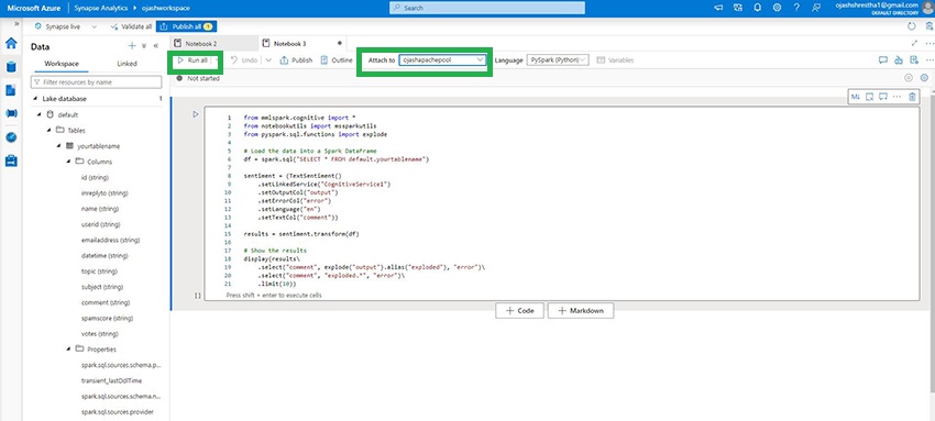 In the Azure Synapse Workspace, you’ll have the Apache Pool running and the linked services connected with the Azure Key Vault, Azure Cognitive Service and Storage.