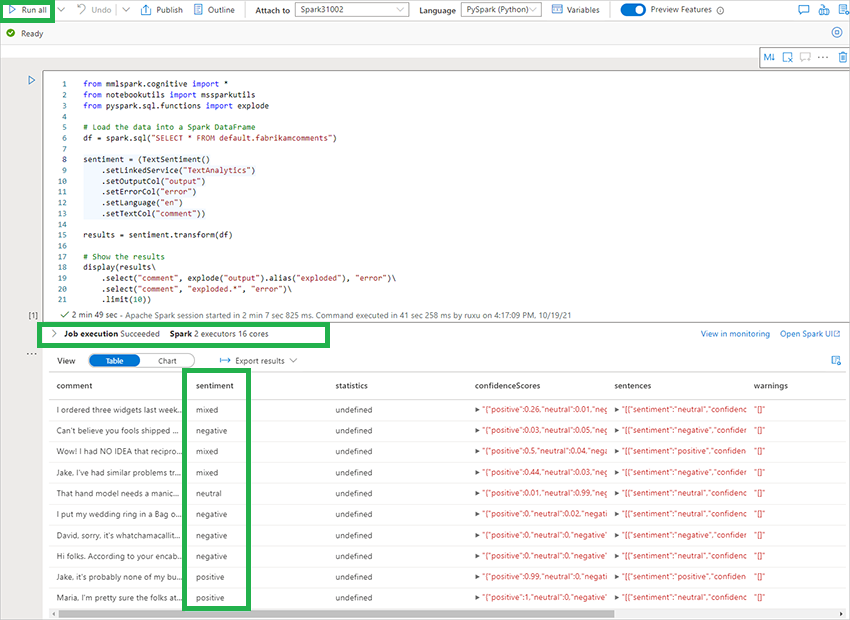 Here, add in the following query. What this does is, it loads your data into the Spark DataFrame and operates Sentiment Analysis – specifically the Text Analytics and thus displays the result.