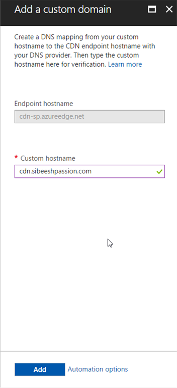 Now, go back to Azure portal, and give the custom domain name we created in the DNS Management Settings, in the Add a custom domain form.