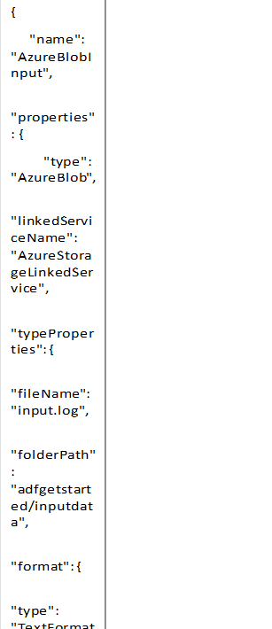 The JSON properties defined above will be dealing with the properties of type, linkedServiceName, filename, type, columndelimiter, frequency/interval and external.