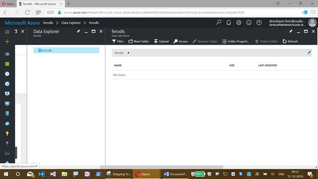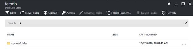 Click on "New Folder" option in the Azure Data Lake Store Blade. In my case, it is “ferodls”