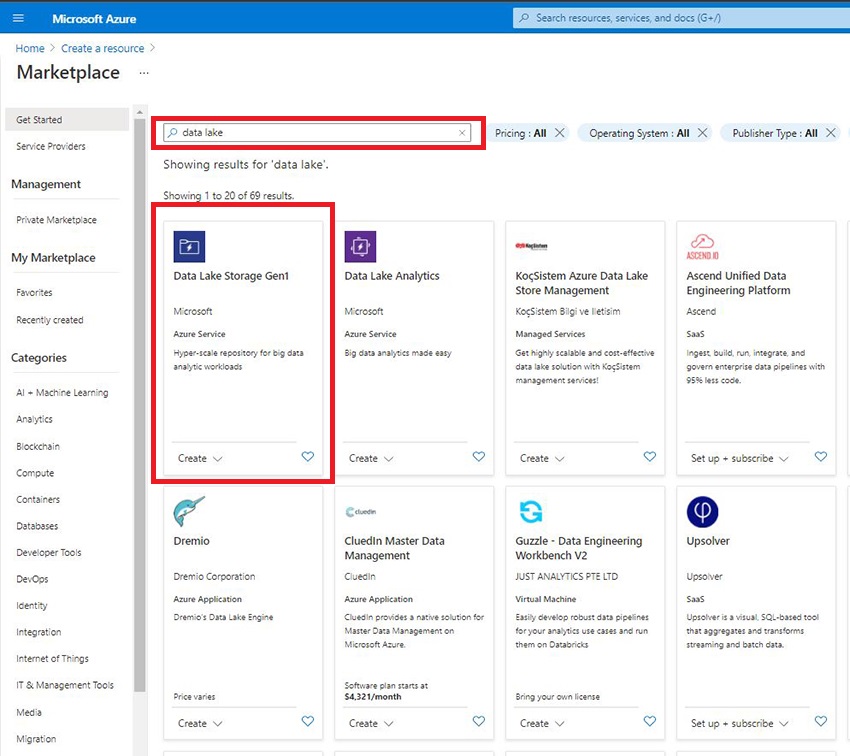 Search for Data Lake. You can see the Data Lake Storage Gen1. Click on that.