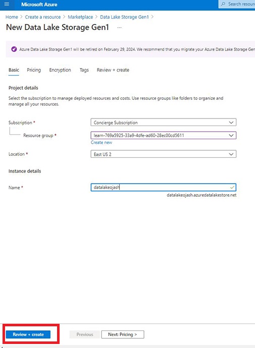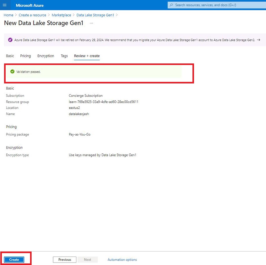 Finally, you can click on Create. This will now create the new Data Lake Storage Gen1 in your Azure.