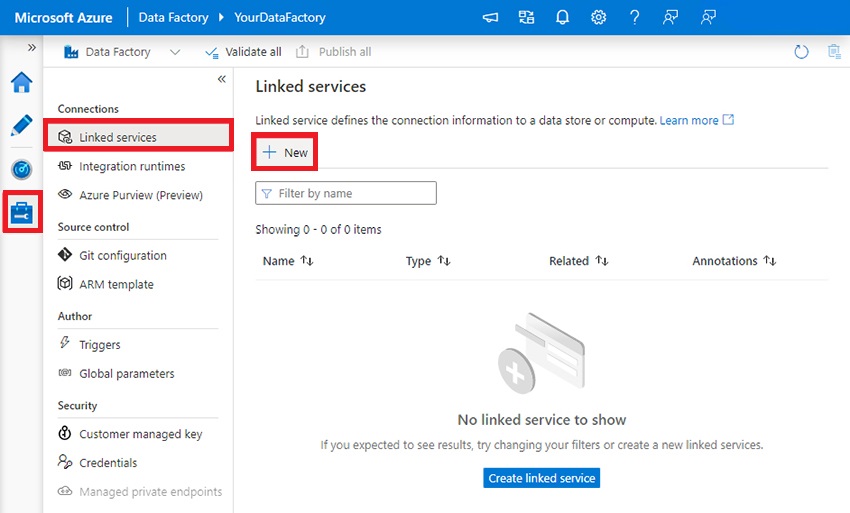 Now, Visit the Azure Data Factory Resource. Click on Linked Services and Select New.