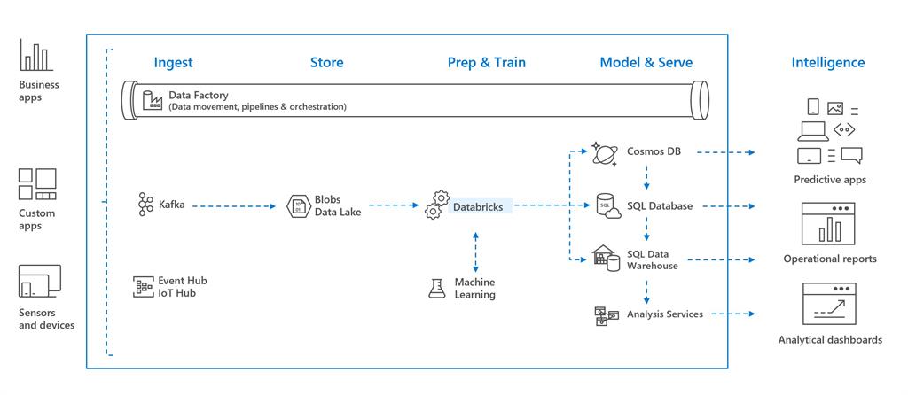 - Azure data bricks this data from one or multiple data stores in Azure and turn in to insights using Spark.